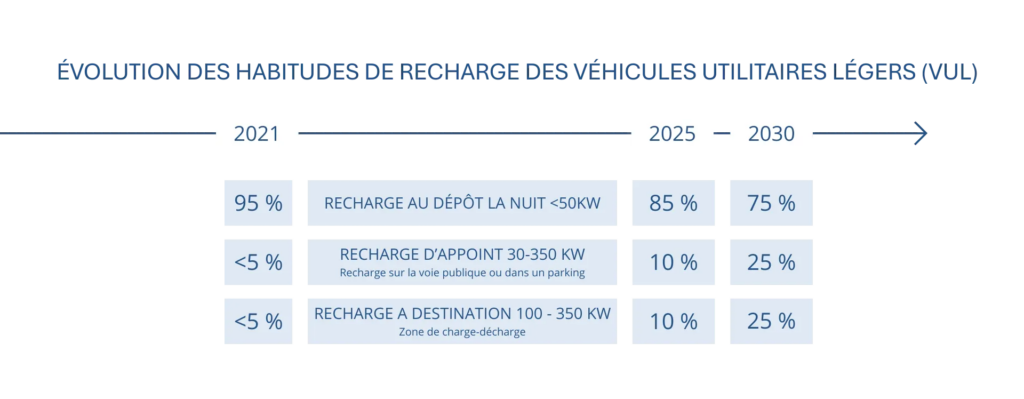 Dans la majorité des cas, les flottes de véhicules utilitaires suivent des circuits prévisibles, avec des consommations identifiables et des retours réguliers vers un même site de stationnement ou dépôt. Ce qui place la recharge nocturne sur site comme l’un des modes de recharge à prioriser. C’est ce que nous confirme une étude pilotée par l’AVERE France, qui montre que la recharge sur site de nuit restera majoritaire dans les années à venir.